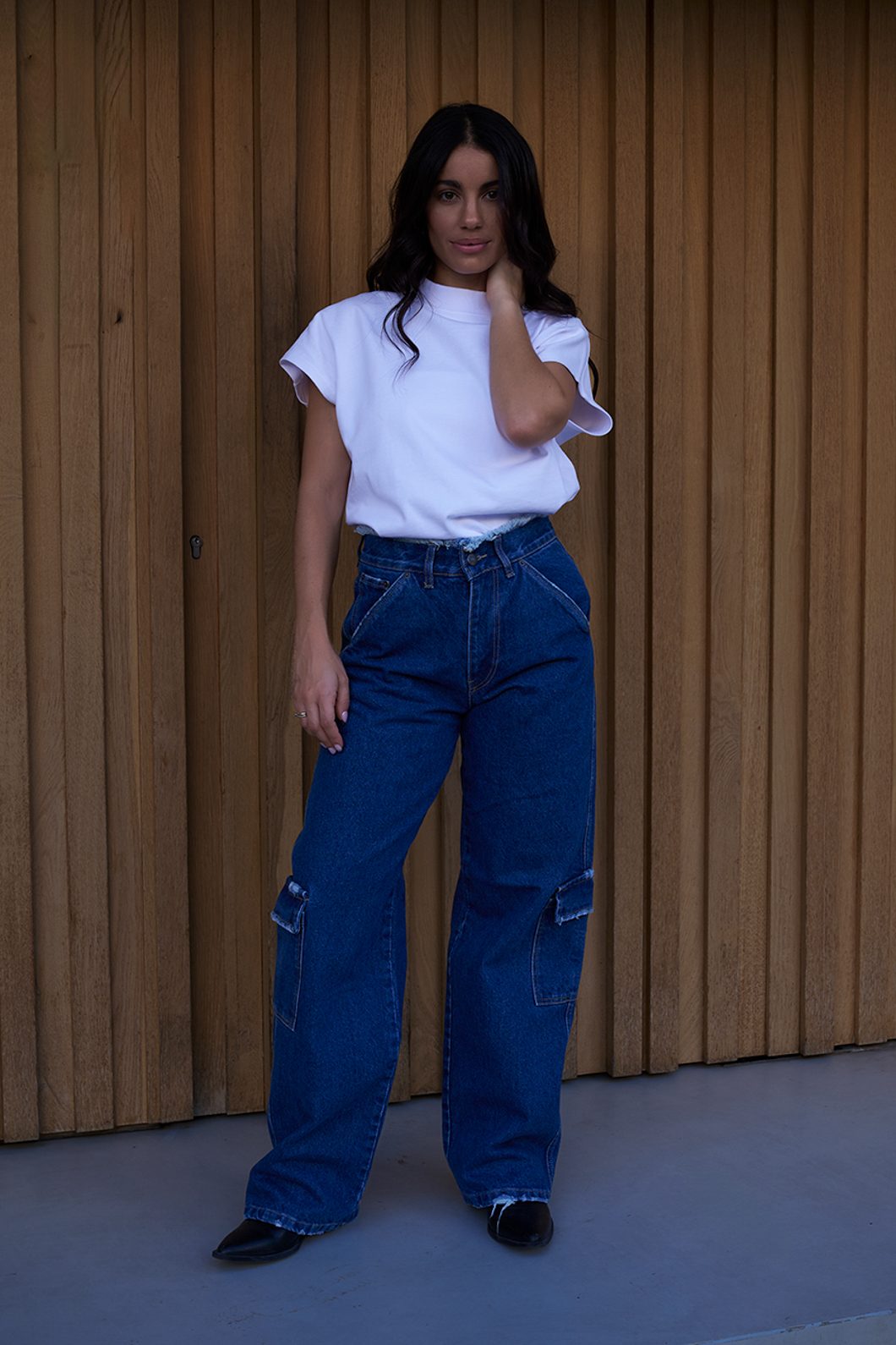 The Aaliyah jeans in dark blue color, with large pockets on the back and on the side, but also with the detail of the rips in the waist, level up all the cargo you’ve tried so far!
