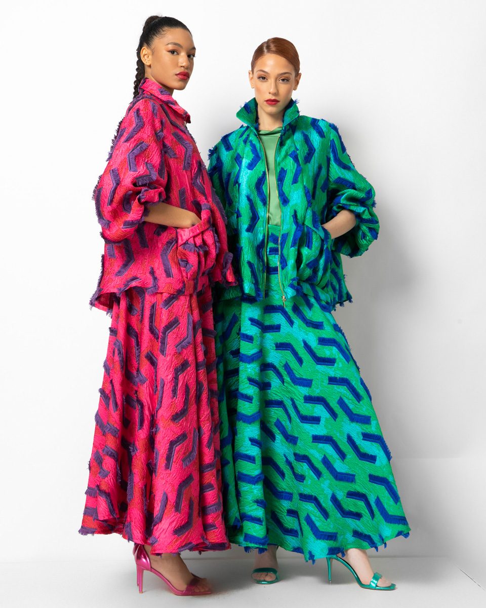 Jacket with a gold zipper in a combination of fabrics with a design of threads. Wide line with gyaca combined with the same long skirt.