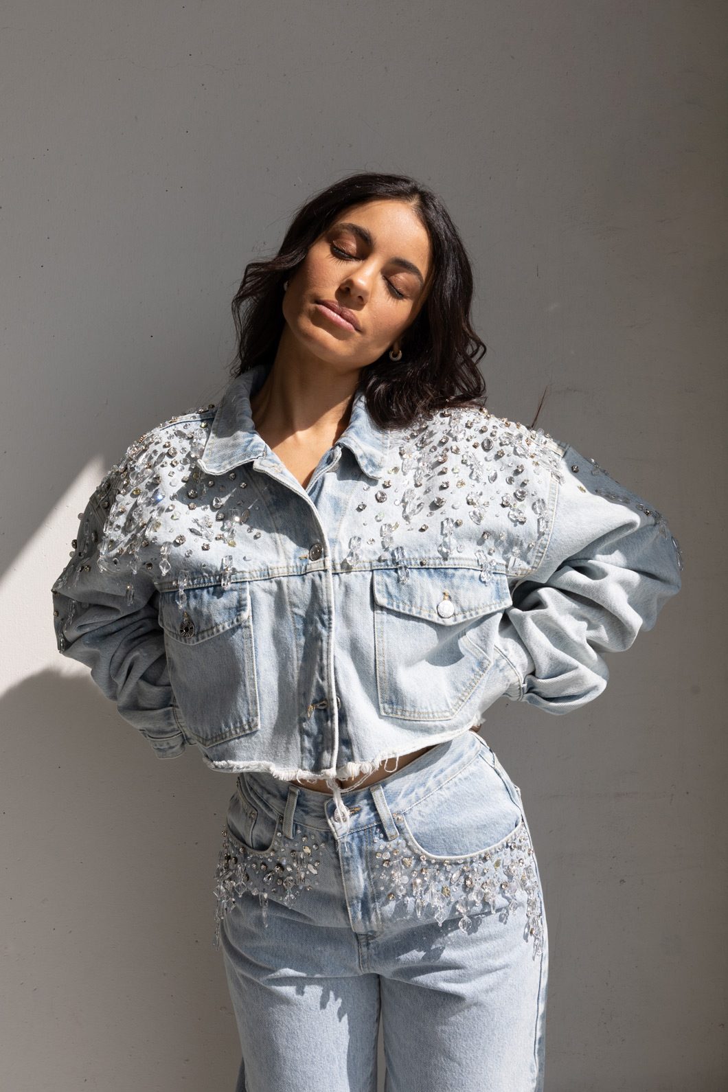 It’s a “Limited Edition” oversized crop denim jacket, in light blue color, it has hand-stitched acrylic stone details and it’s called Clueless!