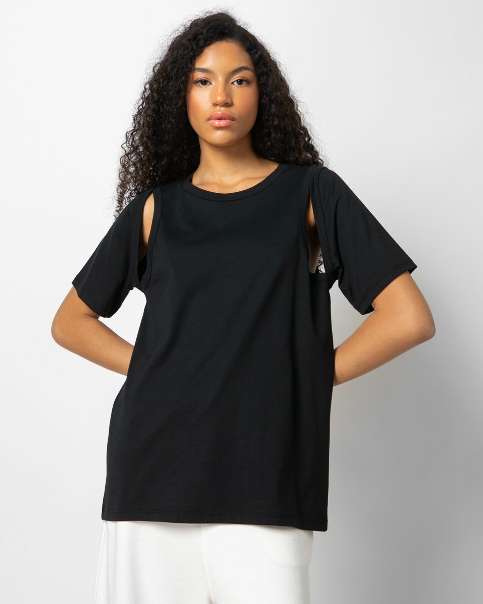 Short-sleeved top with cut on both sides on the shoulders. Loose line, nice weave, easy to wear.
