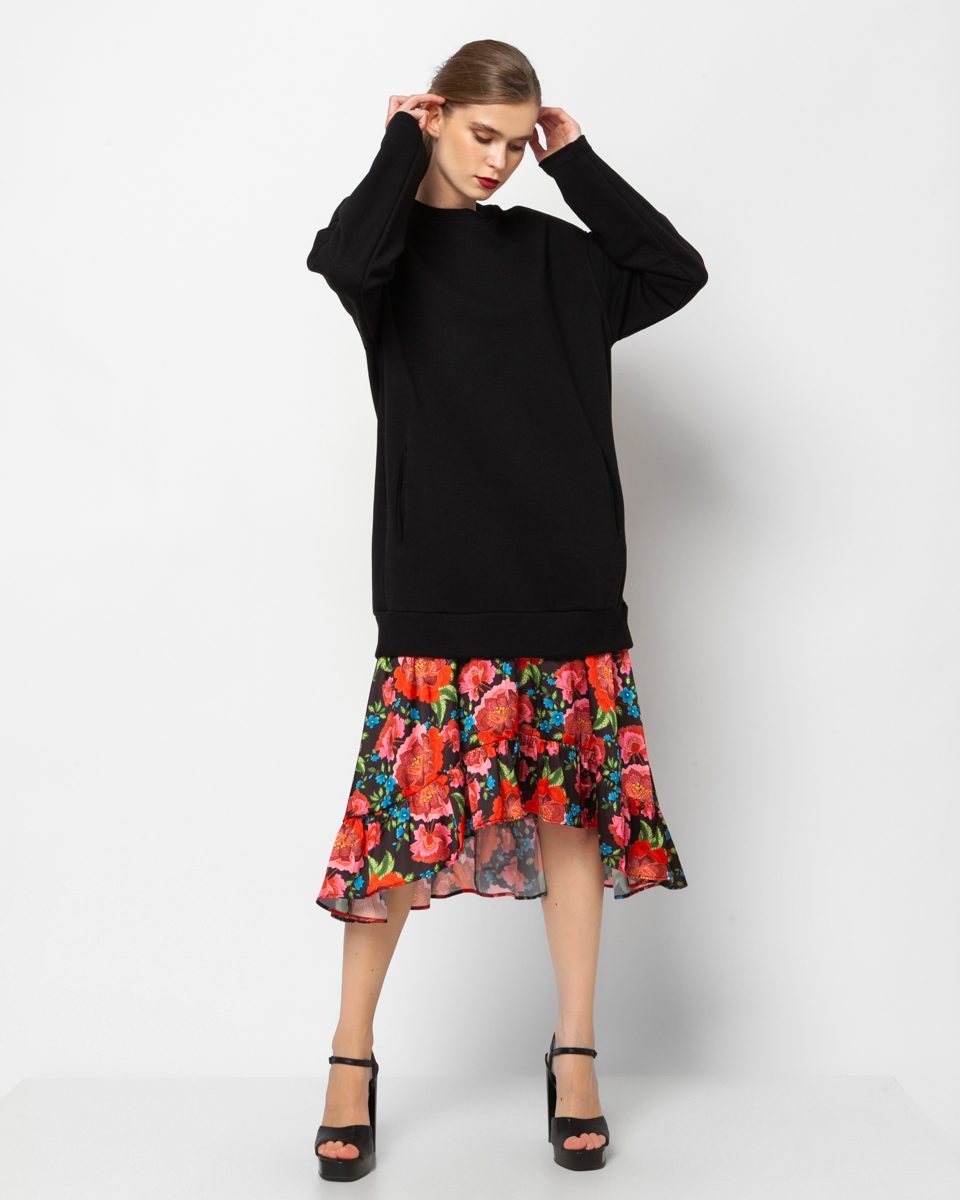 Dress in a combination of sweatshirt fabrics, long-sleeved from the top and the bottom, floral type silk. A special and impressive dress that can be combined with boots and sneakers. Relaxed line.