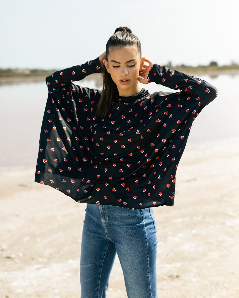 Top long-sleeved asymmetric on the sides of the turtleneck type, low loose. Square sleeve, solid line, elastic sleeve.