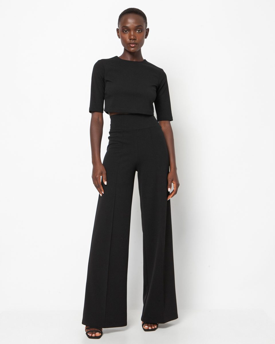 High-waisted bell-bottom pants with elastic band and seam on the front. Soft fabric, comfortable fit, can be worn at all hours by matching the appropriate shoe.