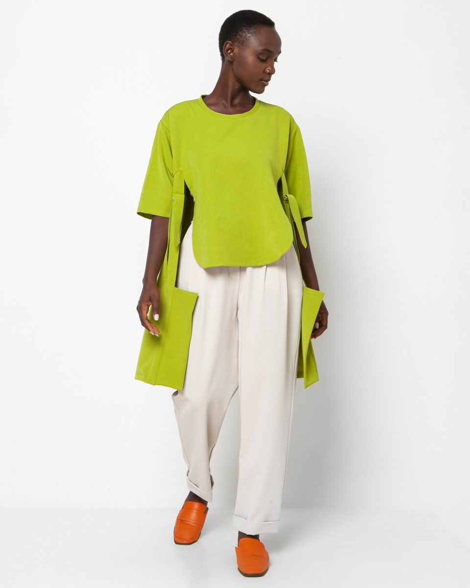 Asymmetric top shorter in the front with side slits and straps that rise and fall. Longer in the back. An impressive and easy to wear top.