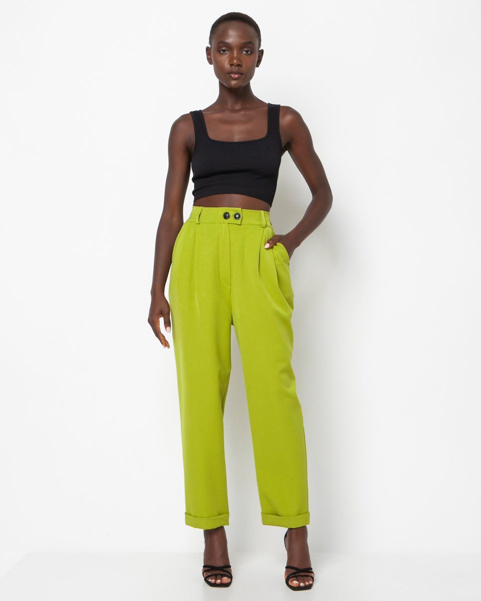 High-waisted trousers with pleats at the bottom. Button closure and elastic at the back and pockets. Relaxed fit. The same is available in a jacket.