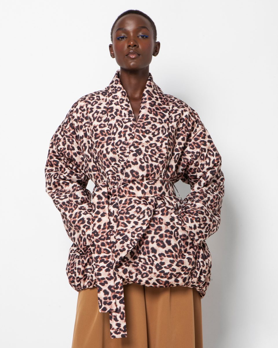 A puffy kimono-type jacket that doesn’t cover the upper part. Very wide comfortable line, impressive leopard print and can be worn with all styles of clothing.