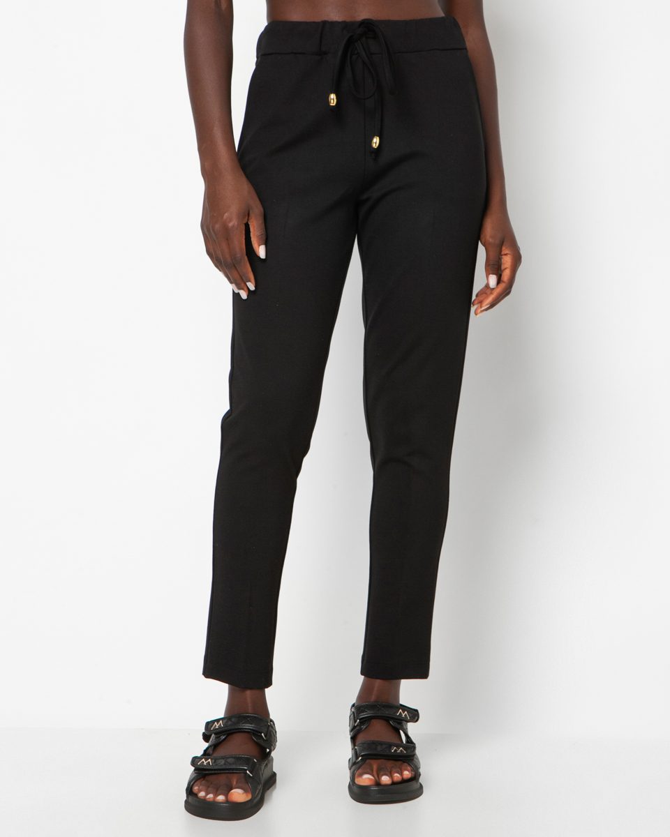High-waisted elasticated trousers with a drawstring in the middle. Sporty fit.