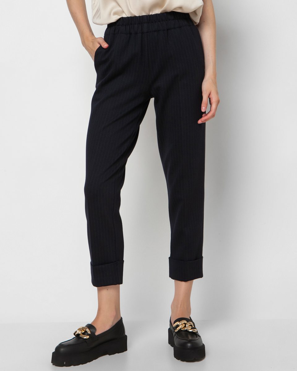 Pants with elastic in the waist and lapels at the end. Fine stripe in the weave, regular line and there is also a jacket of its own, it is a androgynous style. It can be worn with sneakers, moccasins, and boots.