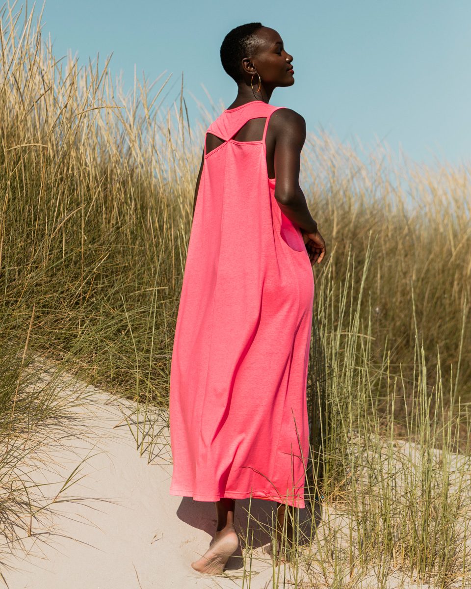 Long sleeveless dress with a design cut on the upper part of the width. Very comfortable and cool style can be worn at all times and occasions with the corresponding shoes and accessories.