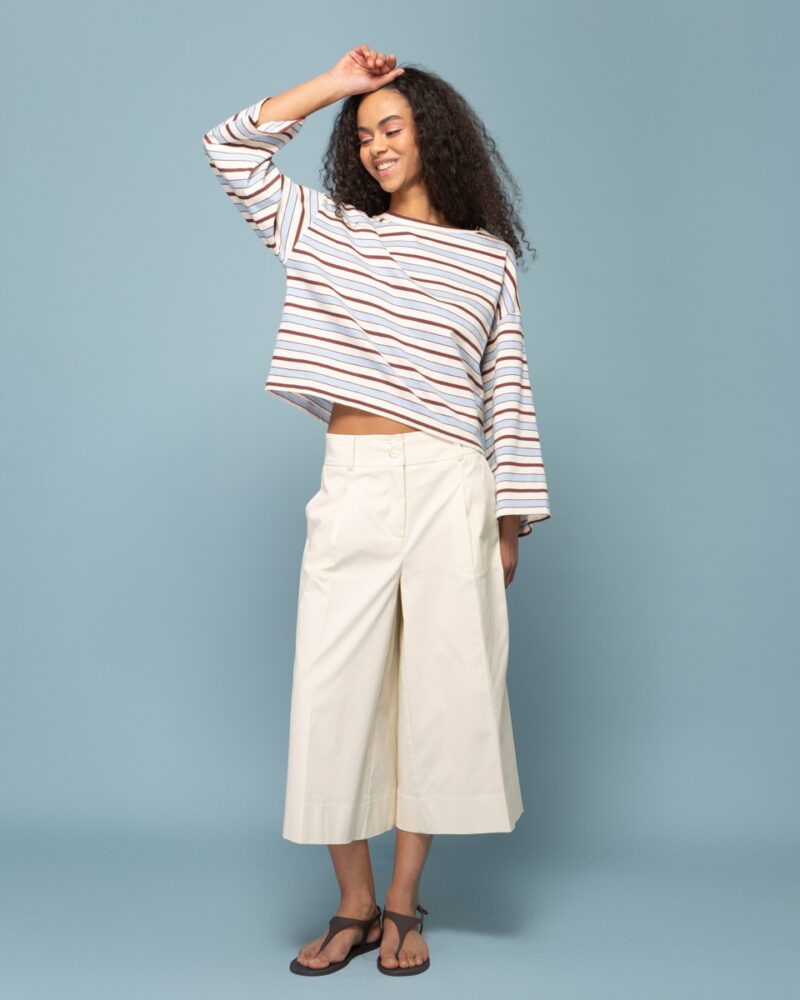 Μακρυμάνικη εκρού μπλούζα με σιέλ & καφέ οριζόντιες ρίγιες.